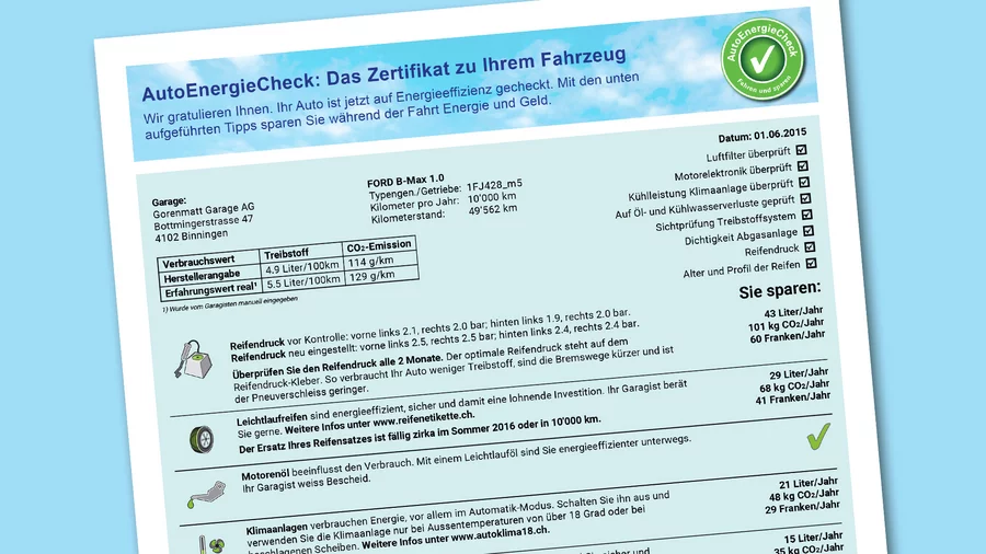 Le CheckEnergieAuto (CEA) est un service écologique de l'UPSA grâce auquel les automobilistes peuvent économiser de l'énergie et de l'argent. Le CAE consiste en quelques travaux effectués sur le véhicule dans l'atelier et se termine par un entretien de conseil personnel.